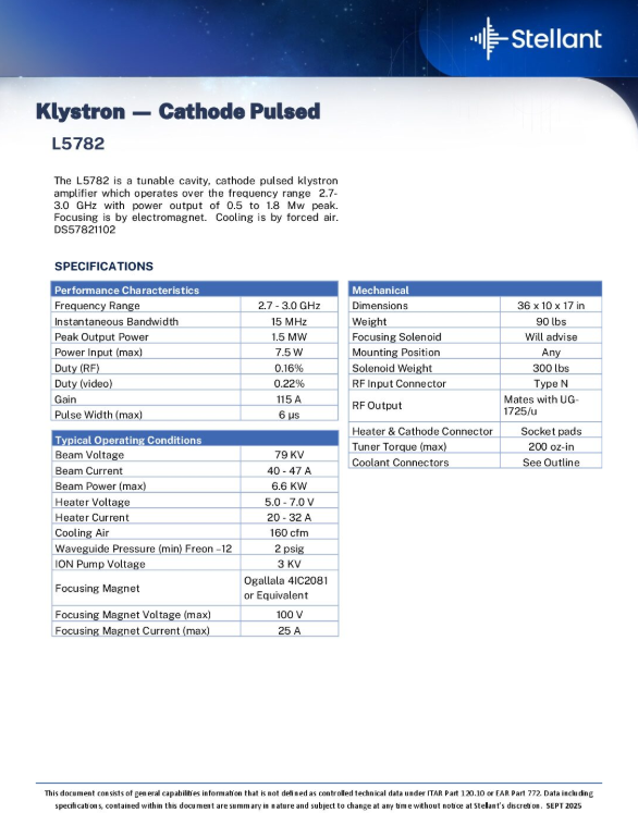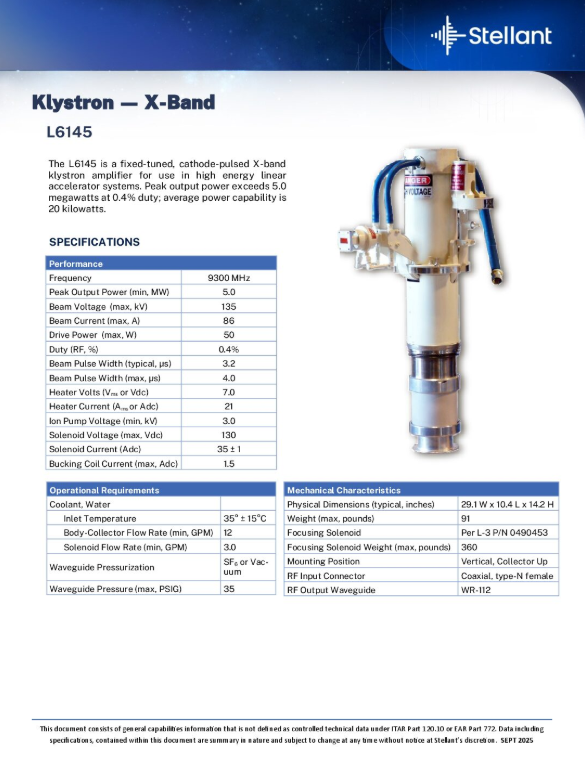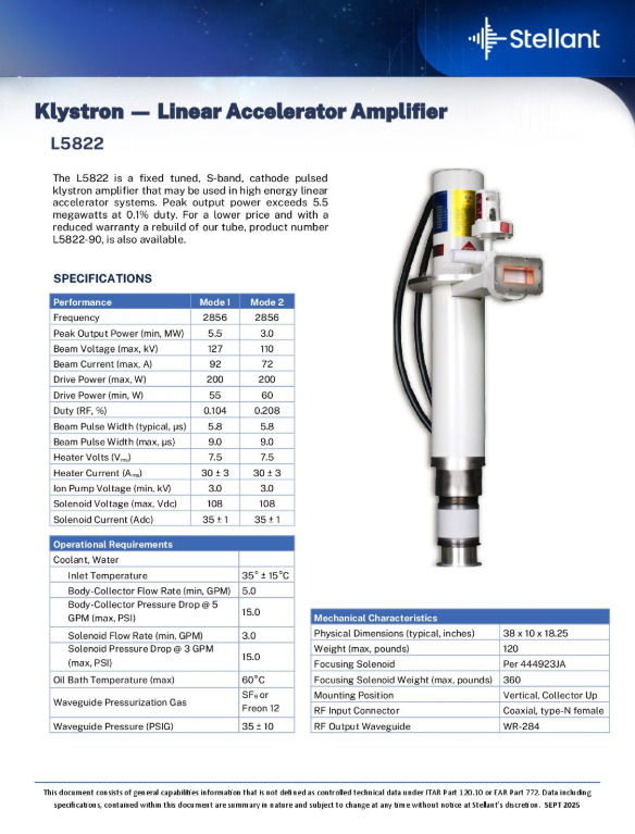 A Stellant klystron is an important vacuum device which is useful in medical linear accelerators because it amplifies the radio-frequency (RF) signals required to produce high-energy particle beams. They are ideal for use in various industries like satellite, radar, wideband high-power communication, medical, high-energy physics etc. For industrial applications Stellant’s Klystrons are used to generate far higher microwave power than solid state microwave devices like Gunn diodes. They can operate over a wide frequency range from hundreds of MHz (UHF) through hundreds of GHz.